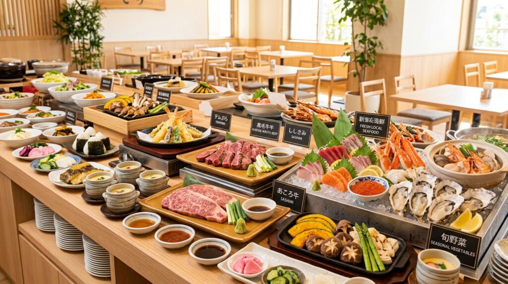 📷️大江戸三つ星バイキングの料理イメージ。黒毛和牛、市場直送の海鮮、ご当地メニューが50種以上!
