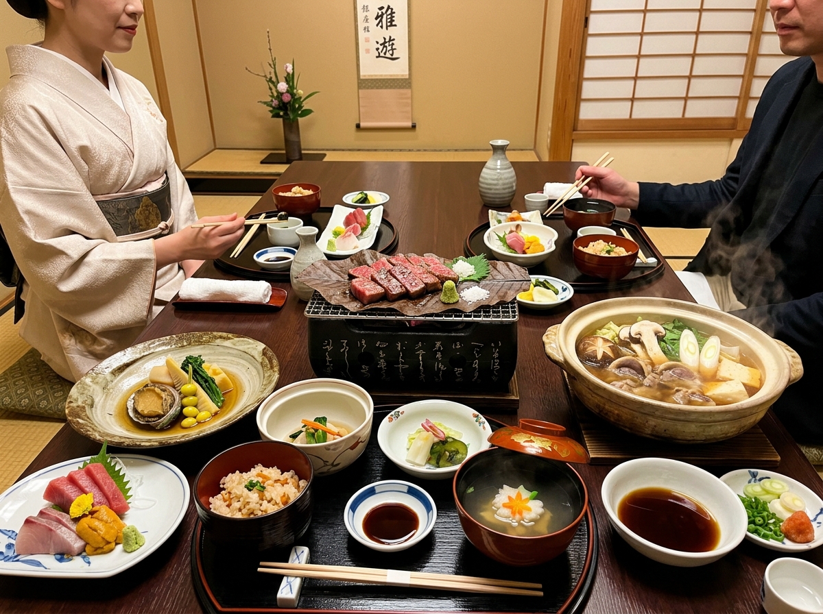 黒毛和牛炭火焼き、鮑、すっぽん鍋など、旬の食材をふんだんに使った日本料理「銀座がゆう」のコース料理。都会の一流和食店のプライベート版です。