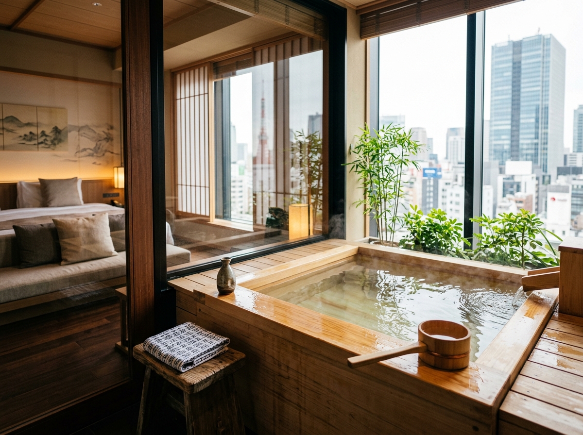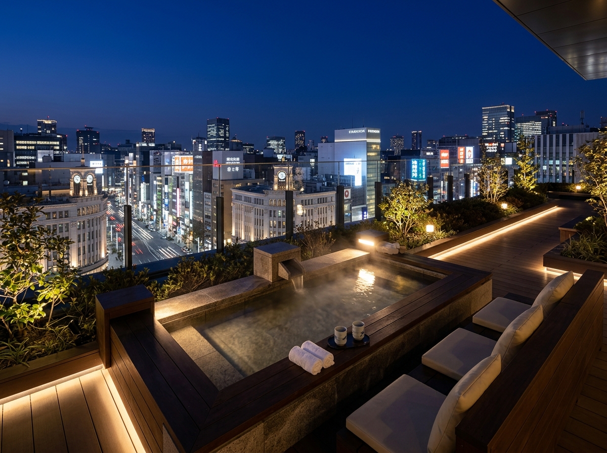 ふふ 東京 銀座:館内完結で過ごしやすく、梅雨対策が万全。雨の日でも、客室温泉と食事で満足度が落ちません。ルーフトップ足湯は、雨音を聴きながら利用するのも情緒的。