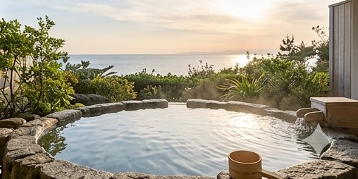 窓を少し開ければ潮風の香りが漂い、時間によって表情を変える海景色を眺めながら温泉を楽しめます。